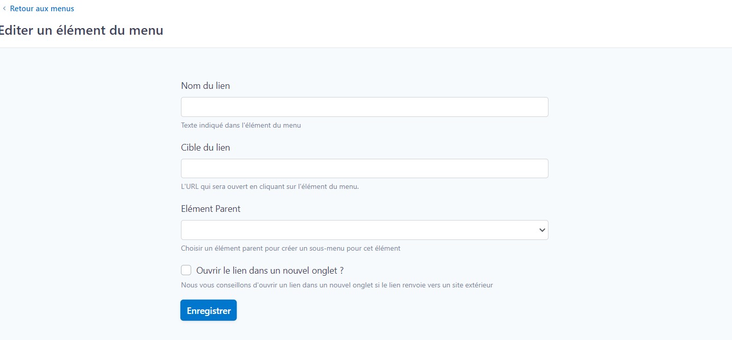 7 - Cliquez sur l'icône d'édition des éléments du menu (avec le crayon). Vous accédez alors à la page d'édition de l'élément.