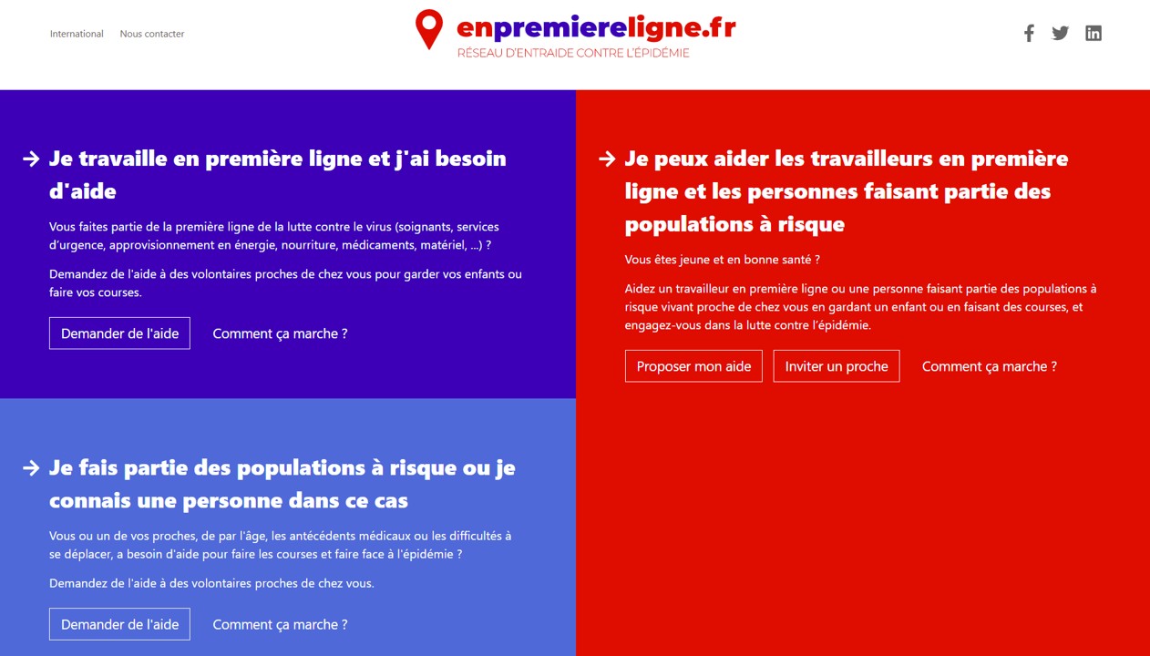 L’initiative enpremiereligne.fr a été lancée le 15 Mars 2020 pour venir en aide aux travailleurs mobilisés contre le virus en les mettant en relation avec des volontaires prêts à les aider pour des tâches clés de la vie quotidienne (garde d’enfants, aide aux courses). Le service opérait sur l’ensemble du territoire français.