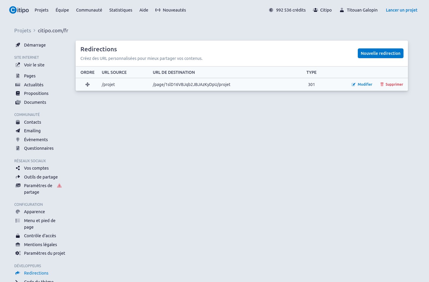 Pour créer des redirections, rendez-vous dans le module Redirections dans la section Développeurs de votre projet, et créez une Redirection :