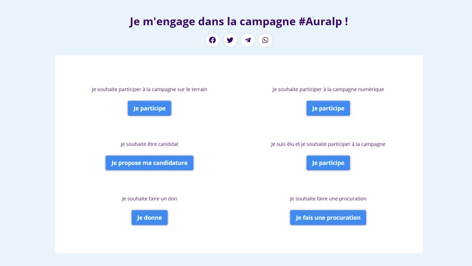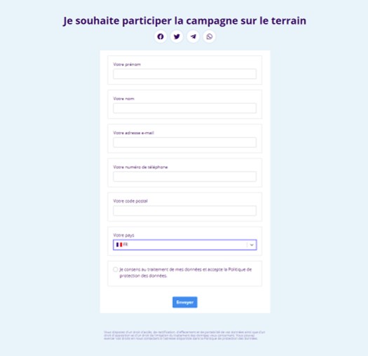 Un site de campagne n'est pas un simple site de contenu relayant vos actualités. Il doit vous permettre d'engager activement vos visiteurs en leur proposant de rejoindre la campagne et d'y participer.