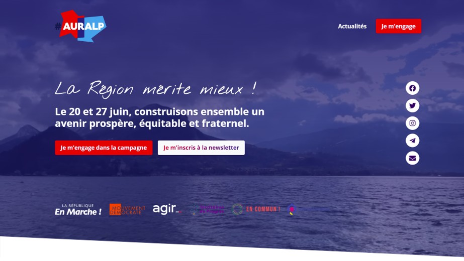 Un exemple d'utilisation efficace est celui de la campagne régionale AURALP (auralp.fr) qui propose deux options claires aux visiteurs. L'option principale 'Je m'engage" est conçue pour les sympathisants les plus motivés, prêts à venir grossir les rangs de l'équipe de campagne. L'option secondaire "Newsletter" permet aux simples sympathisants de rester facilement dans l'écosystème en recevant des informations ponctuelles.