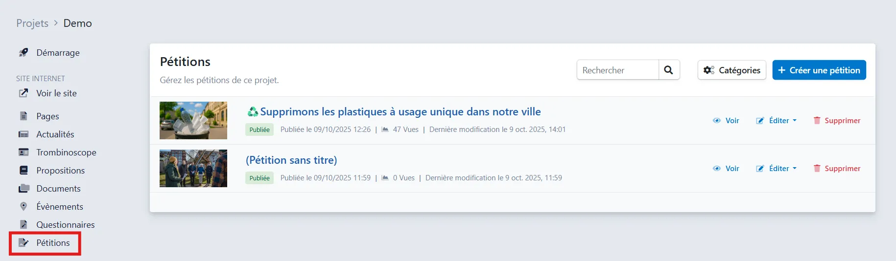 Dans le module Pétions d'un projet, cliquer sur "Créer une pétition".
