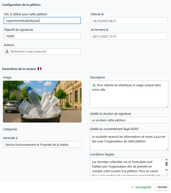 Ce menu vous permet d'éditer les éléments clés de la pétition, comme la personnalisation de l'url, la date d'activité, le destinataire de la pétition ou encore l'objectif de signatures.