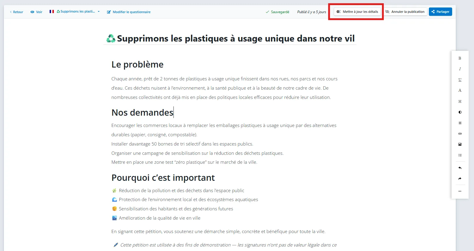 ¨Pour modifier le bloc de présentation, cliquer sur "Editer". Vous serez redirigé vers l'éditeur de texte habituel de Citipo. Pour modifier les éléments spécifiques de la pétition, cliquer sur "Mettre à jour les détails" (encadré rouge ci-dessous).