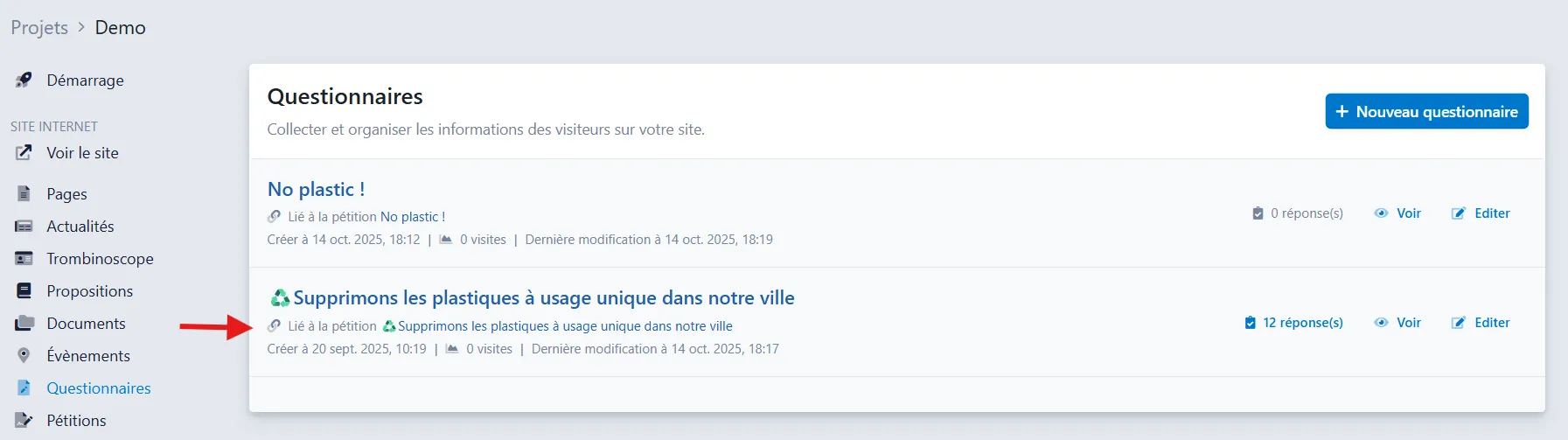 Lors de la création d'une pétition, un questionnaire entièrement personnalisable est associé. Vous pouvez le consulter dans le module Questionnaire. Ce questionnaire ne peut pas être supprimé si la pétition n'est pas supprimée.