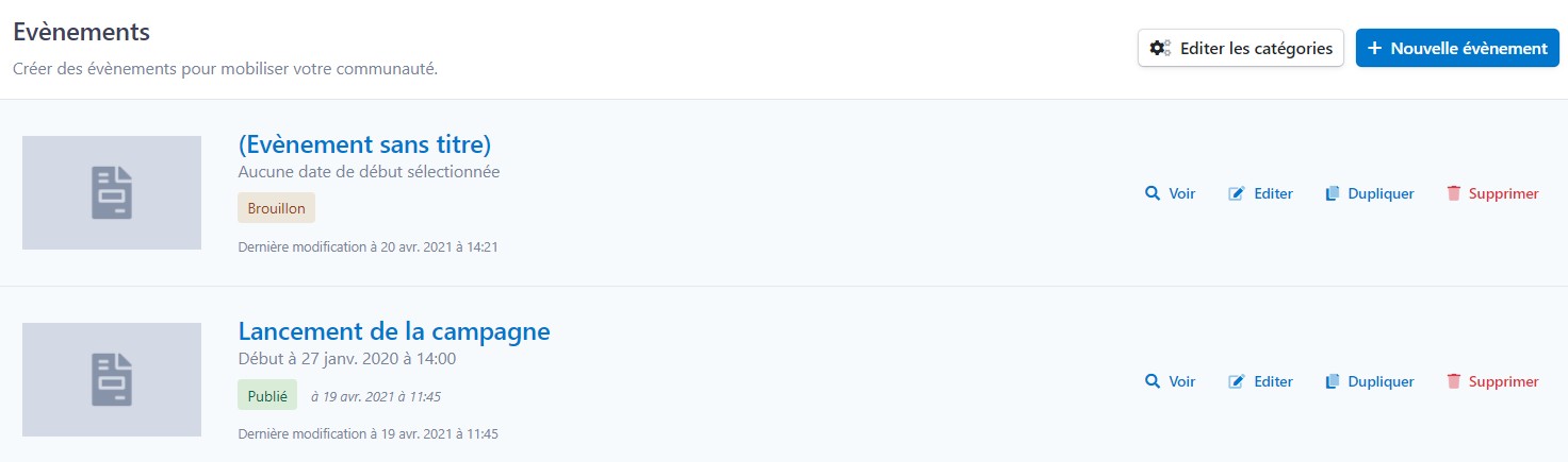Les évènements, physiques ou en ligne rythment la vie des organisations militantes. Le succès d'un évènement dépend beaucoup de la campagne de communication qui y est associée. Le module Evènements permet de générer un lien annonçant un évènement.