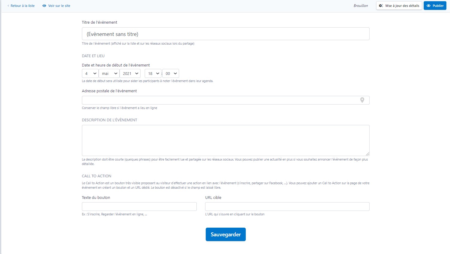 Une fois votre événement paramétré, n'oubliez pas de sauvegarder. Si ce dernier est prêt à être publié, cliquer sur "Publier".
