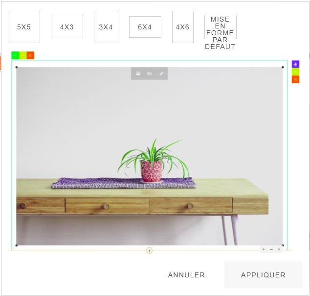Vous pouvez recadrer l'image directement sur Citipo en sélectionnant l'icône en forme de crayon (ci-dessous). Le menu vous permet de modifier le format de l'image chargée selon des formats ou de façon personnalisée. Pour des soucis de qualité du fichier final, nous vous recommandons toutefois d'importer une version déjà finalisée de l'image.