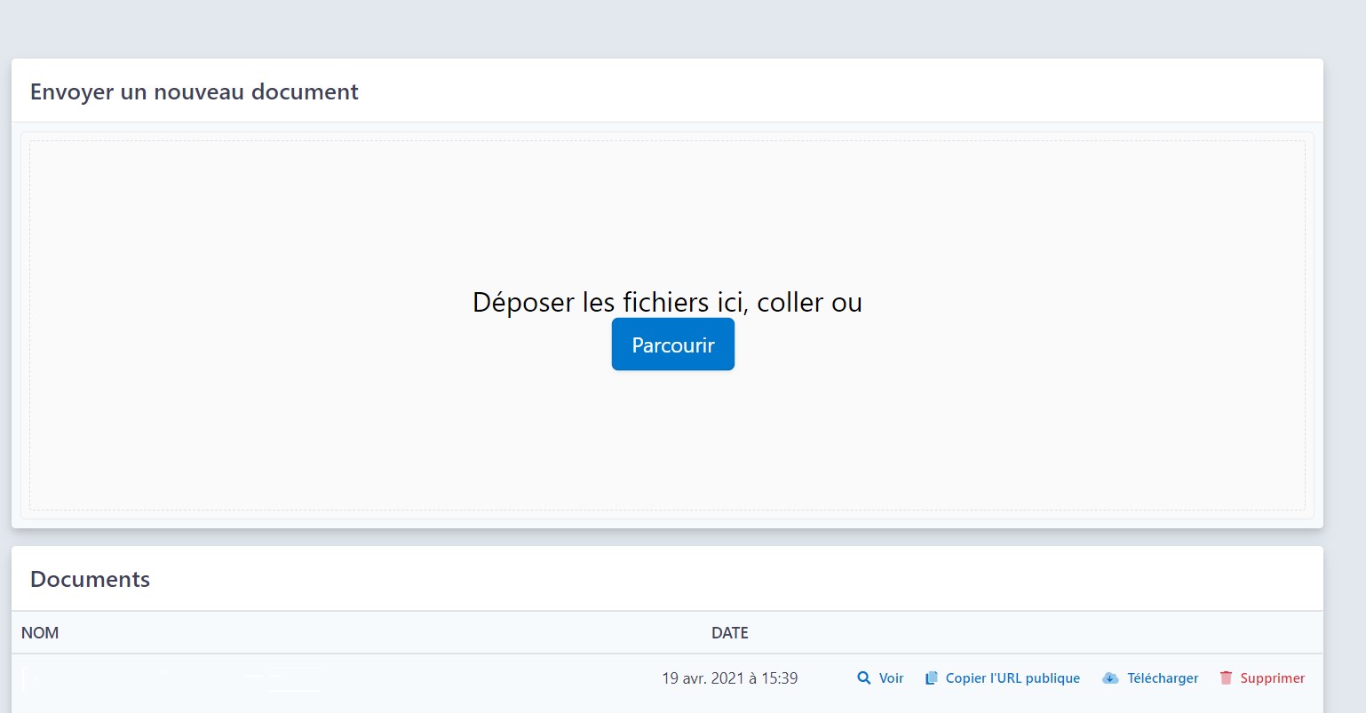 Une fois le chargement terminé, votre fichier sera ajouté à la liste des documents disponibles. Vous pouvez utiliser cet espace comme un espace de stockage pour votre organisation ou vous servir de l'URL publique générée automatiquement pour le partager.