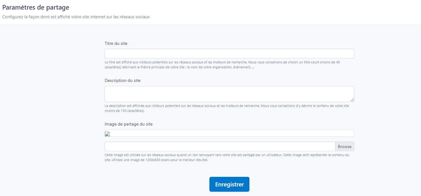 • Le champ Titre du site sera la titre affiché aux visiteurs qui verront le partage de votre site sur les réseaux sociaux.