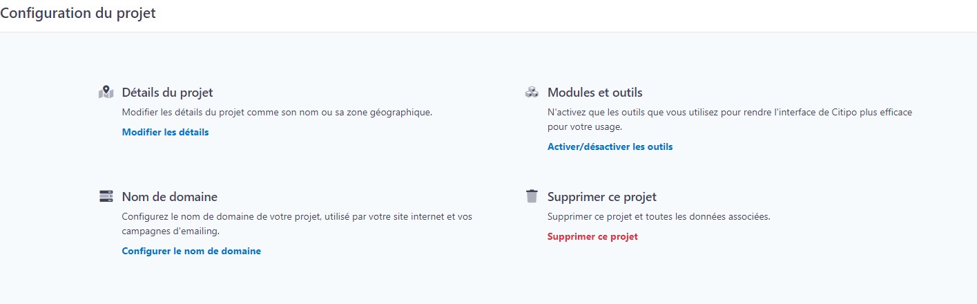 Un projet Citipo est constitué d'un site internet spécifique et d'outils d'animation de communauté. Il est rattaché à une organisation sous forme de projet global ou local.