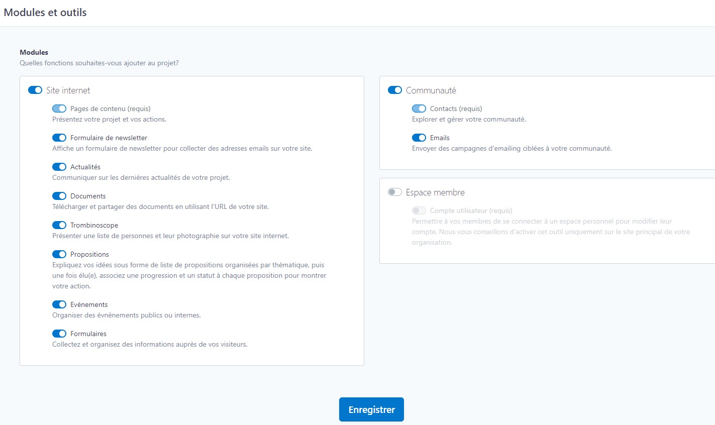 L'onglet "Modules et outils" permet d'activer ou de désactiver les modules utilisables dans le projet. En pratique, c'est ici que vous pouvez désactiver le site internet pour les projets qui n'en ont pas besoin.
