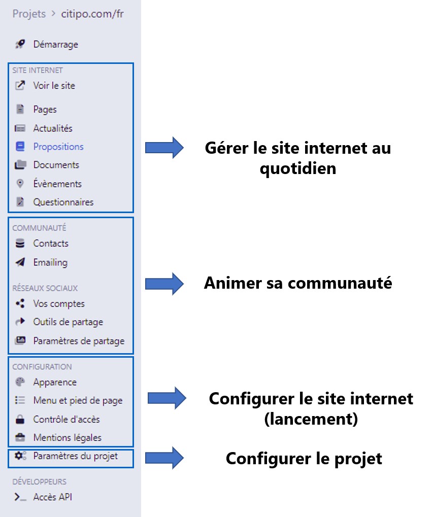 Les modules des menus et "Configuration" regroupent les éléments nécessaires à la configuration et la personnalisation du site du projet et de ses réseaux.