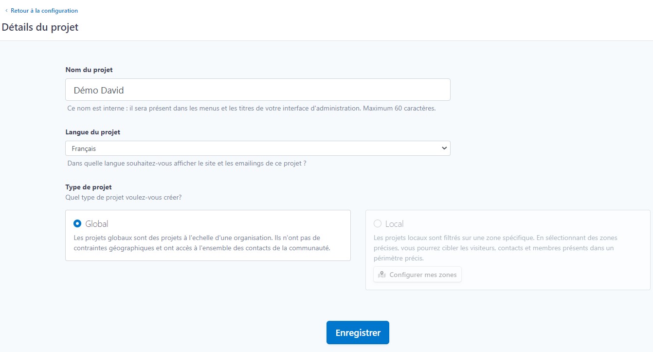 Dans les "Détails du projet", vous pourrez modifier le nom de votre projet (à usage interne), la langue dans laquelle vous souhaitez afficher le projet et le site par défaut (anglais ou français) ainsi que votre type de projet (global ou local).